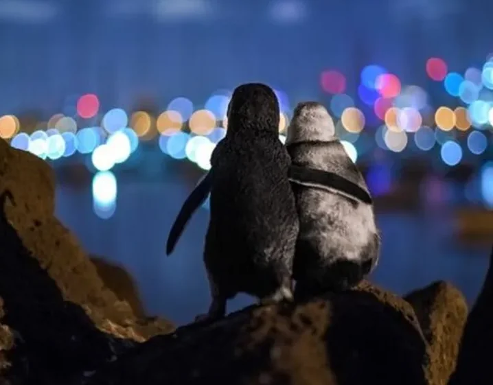 Um clique surpreendente está comovendo o mundo ao mostrar dois pinguins viúvos aparentemente se consolando em frente às luzes de Melbourne, na Austrália. O registro, feito pelo fotógrafo alemão Tobias Baumgaertner, capturou o momento íntimo dos animais em uma pose que parece humana — com as asas entrelaçadas como se compartilhassem a dor da solidão. A imagem ganhou destaque internacional ao vencer o concurso Ocean Photography Awards 2020.