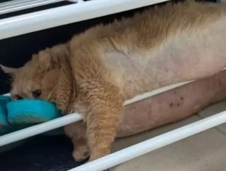 Gato obeso tenta fugir da dieta e fica entalado em sapateira: cena vira show à parte no abrigo