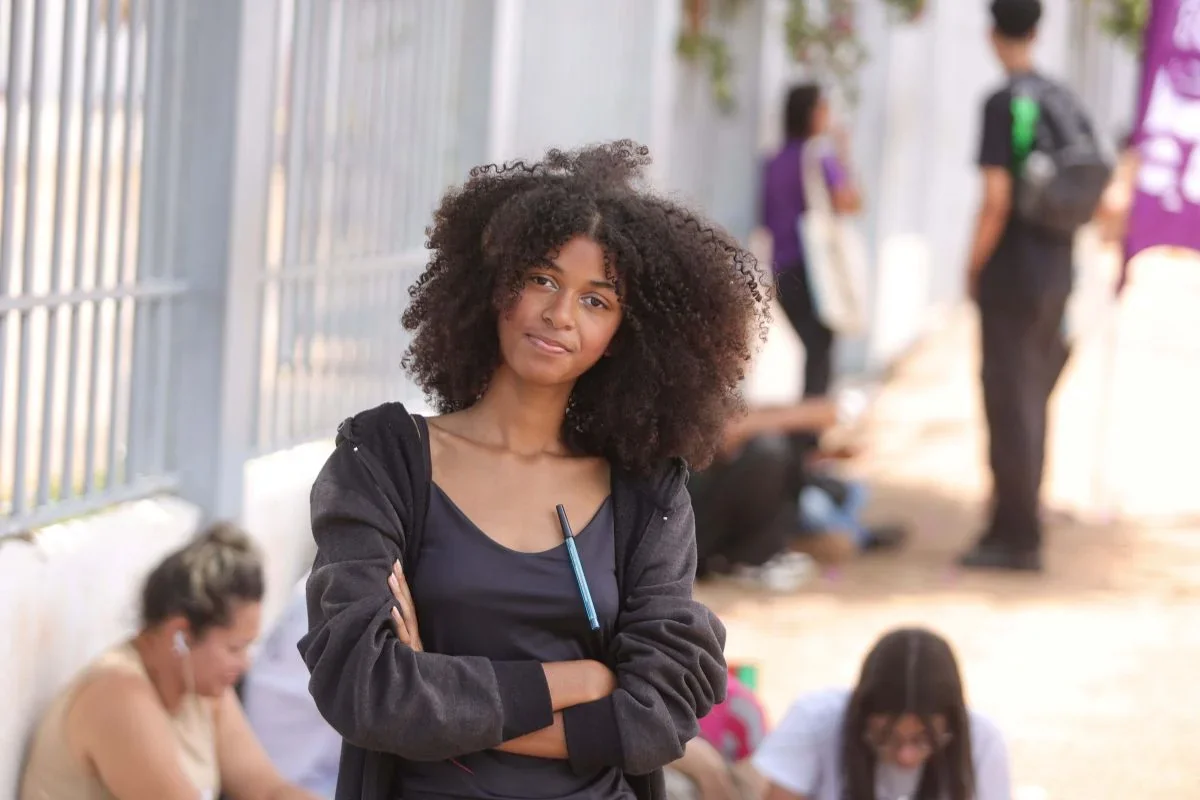 Kylla Maia, de 16 anos, participa do Enem como “treineira” e encara a prova como uma preparação para o próximo ano. Ela afirma que não vai se estressar com questões difíceis e que seu foco será resolver o que sabe. Apesar de não se sentir forte nas disciplinas exatas, considera a experiência valiosa para o futuro, quando pretende prestar vestibular para Psicologia ou Artes.