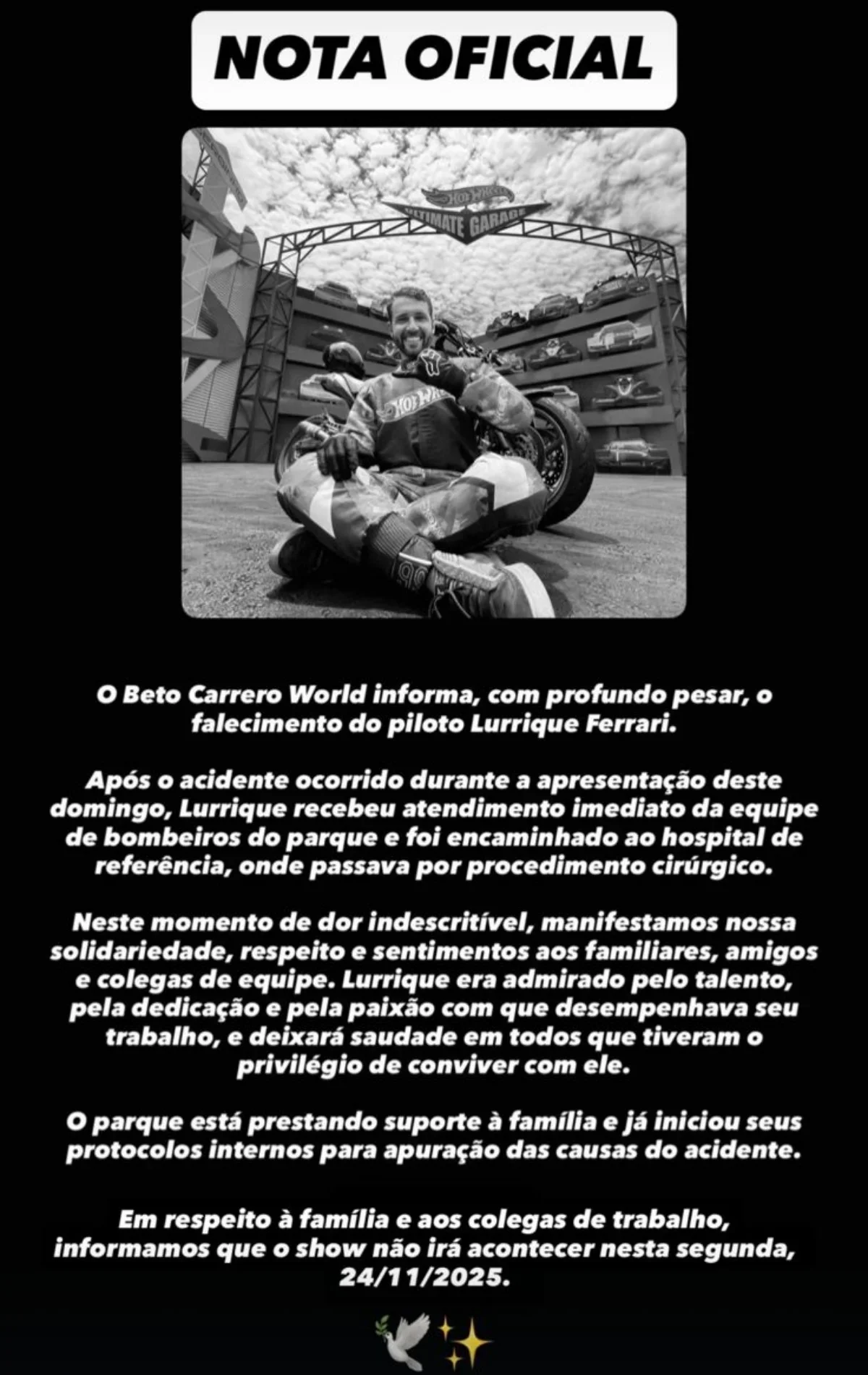 O piloto Lurrique Ferrari, de 36 anos, faleceu após sofrer um grave acidente durante uma apresentação de manobras radicais no parque temático Beto Carrero World, localizado em Penha, Santa Catarina, no último domingo (23/11). Conhecido por suas acrobacias em motocicleta, Ferrari participava de um show quando, ao tentar saltar de uma das rampas, não conseguiu alcançar a estrutura seguinte, colidindo com a área de aterrissagem.