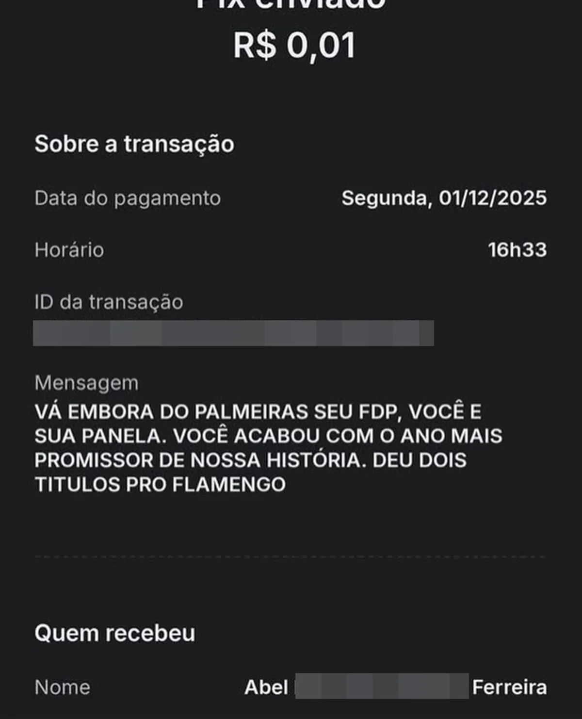 Além das mensagens via Pix, o treinador português também foi alvo de comentários agressivos em seu perfil no Instagram. “Vá embora do meu Palmeiras! Arrogante! Você não é maior que a sociedade esportiva Palmeiras”, escreveu um seguidor. Outros pediram para que ele não renovasse o contrato e deixasse o time: “Não renove, Abel. Pelo bem do Palmeiras e da sua história dentro do time!”. Também houve quem lembrasse de promessas anteriores feitas pelo técnico sobre uma possível saída.