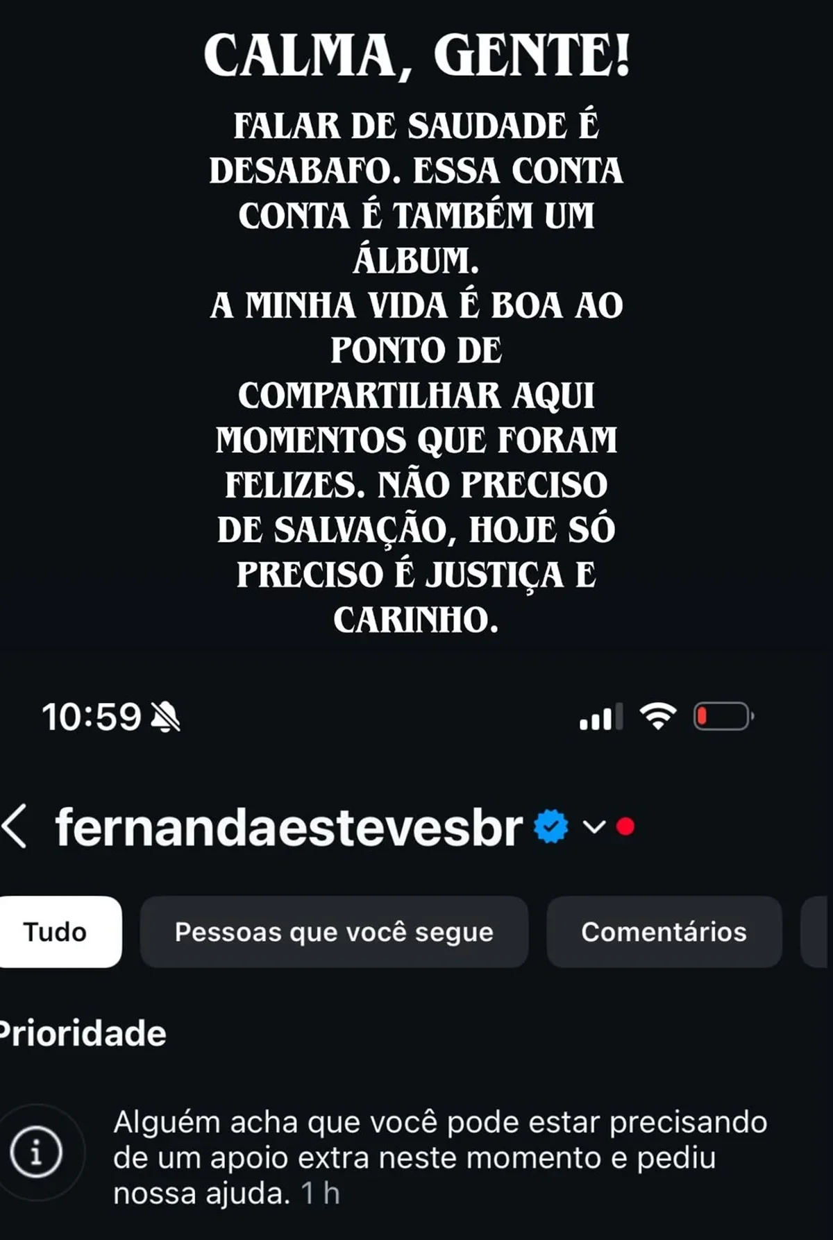 Nos stories, Fernanda mostrou que recebeu mensagens sugerindo apoio emocional, incluindo o contato do Centro de Valorização da Vida (CVV). Em resposta, ela tranquilizou os seguidores, afirmando que estava bem e que falar de saudade é uma forma de desabafo, não um pedido de socorro. “Não preciso de salvação. Hoje só preciso é Justiça e carinho. Tá tudo bem”, escreveu.