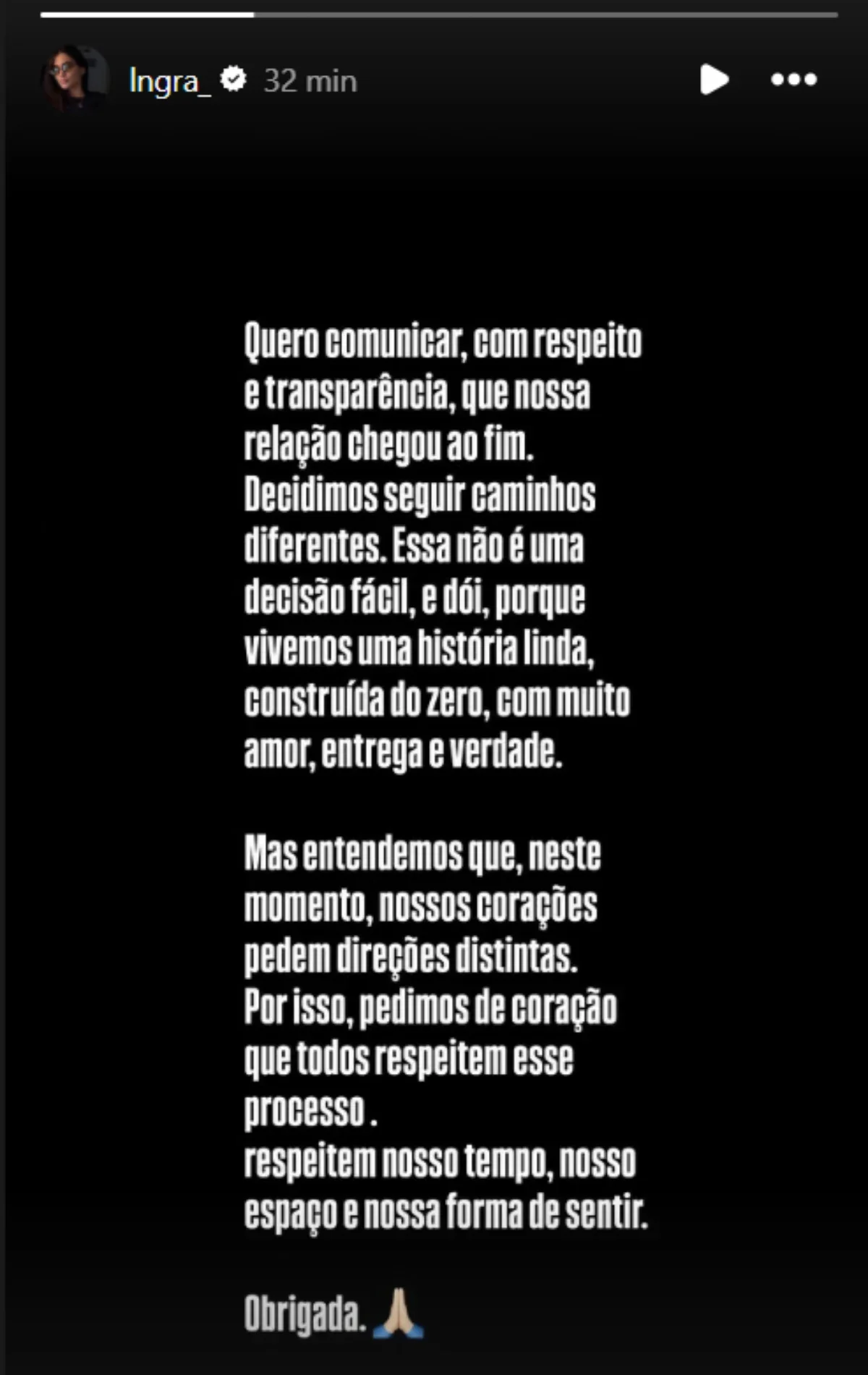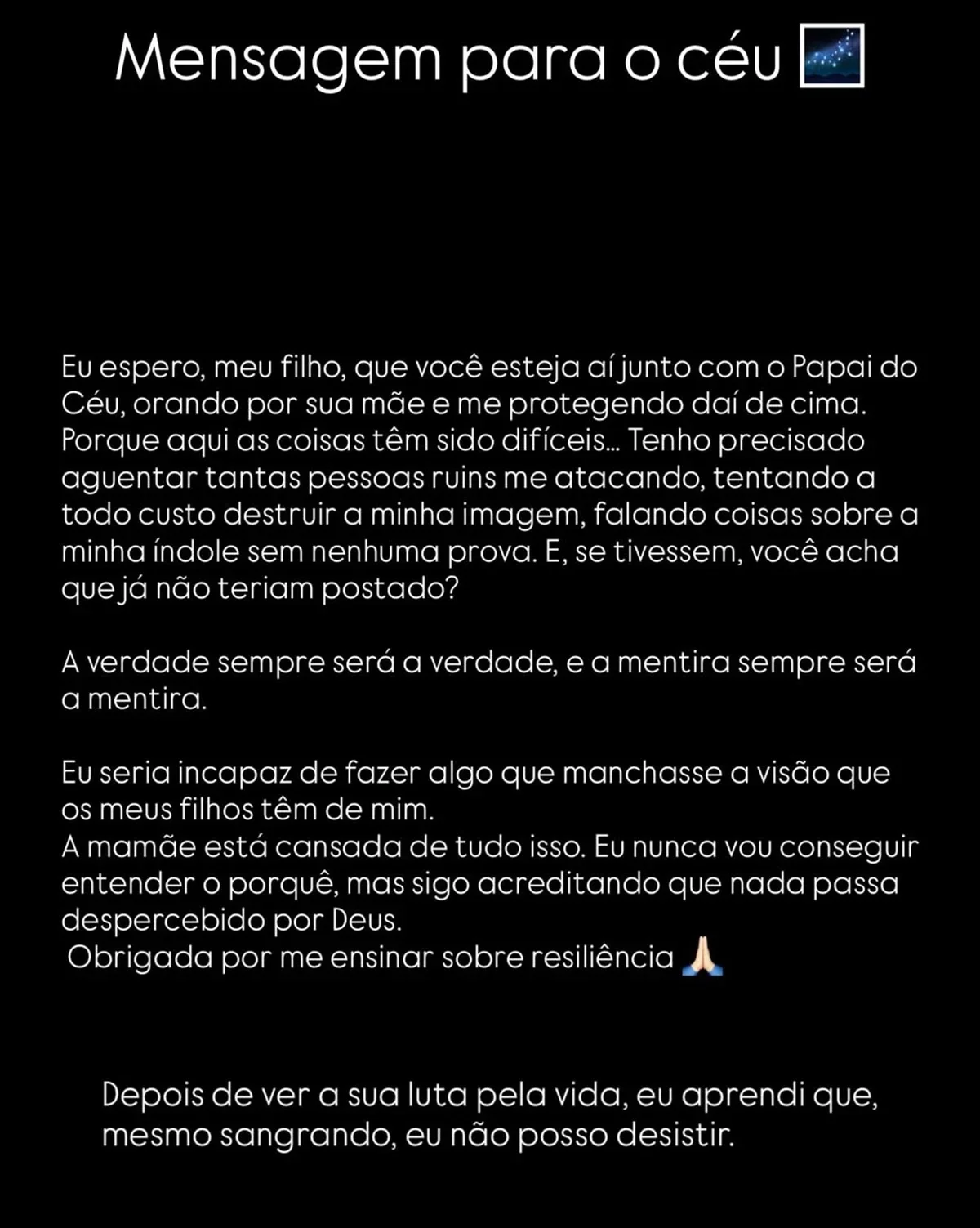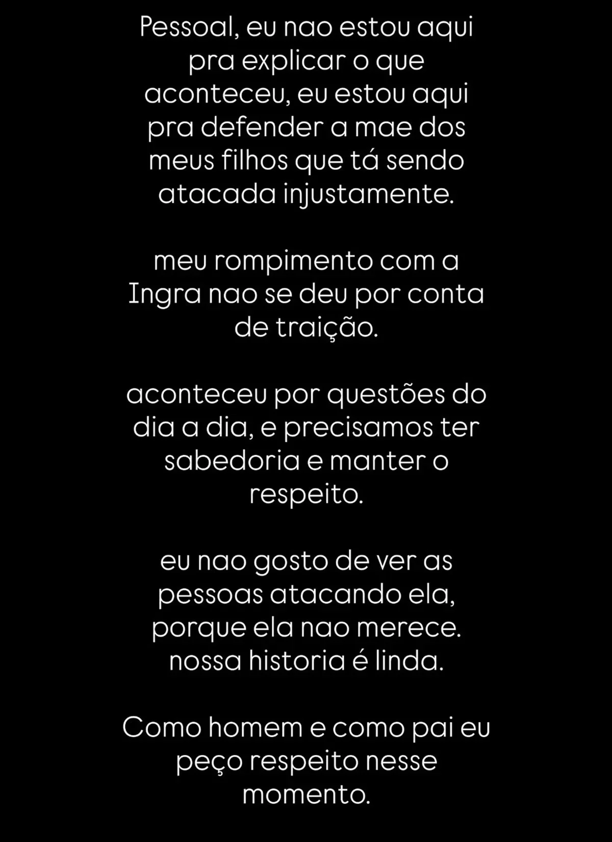 Horas antes, Ingra Soares havia feito um comovente desabafo em suas redes sociais. Ela relembrou o filho do casal, que faleceu no ano anterior, e compartilhou uma mensagem emocional: “Espero, meu filho, que você esteja aí junto com o Papai do Céu, orando por sua mãe e me protegendo daí de cima”. A influenciadora também reclamou dos ataques que tem sofrido desde o anúncio da separação. “Tenho precisado aguentar tantas pessoas ruins me atacando, tentando destruir minha imagem”, afirmou, negando qualquer atitude que pudesse comprometer sua integridade ou a visão que os filhos têm dela.