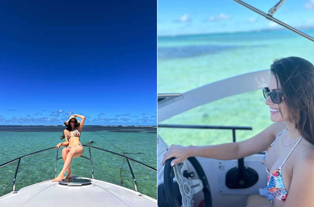 Calita Franciele usou as redes sociais neste sábado (28), para mostrar registros de sua passagem por Morro de São Paulo, destino turístico da Bahia. Casada com o cantor Amado Batista, a modelo e influenciadora apareceu de biquíni enquanto pilotava uma lancha durante o passeio.