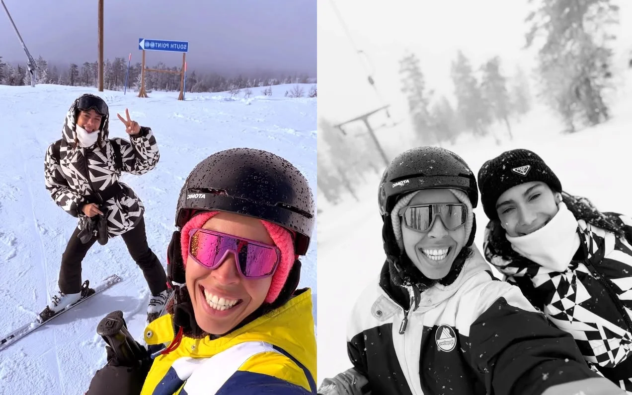 Além de acompanhar a aurora boreal, a artista tem aproveitado a estadia para praticar atividades no frio, como o esqui.